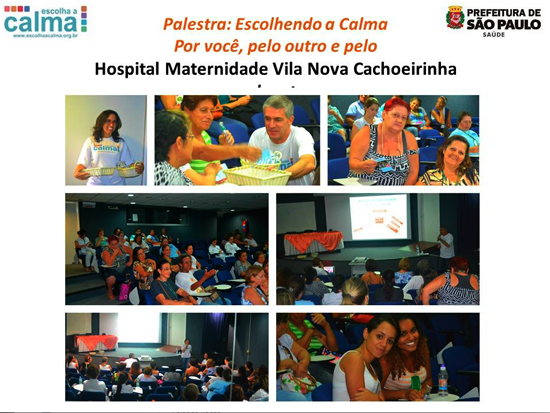 Cerca de 20 funcionários do Hospital Maternidade Vila Nova Cachoeirinha, em São Paulo, SP, participaram da palestra “Escolhendo a Calma por você, pelo outro e…pela Maternidade Vila Nova Cachoeirinha”, ministrada pelos voluntários Solange Viana e Álvaro Oliveira. A participação do público foi intensa e produtiva. Ao final, todos se envolveram no jogo ‘Escadas e Serpentes”, atividade lúdica da campanha Escolha a Calma onde todos podem assimilar, de maneira divertida e consciente, os 12 valores da campnha Escola a Calma: Amor, Perdão, Tolerância, Confiança, Respeito, Humildade, Flexibilidade, Paciência, Humor, Compaixão, Cooperação e Gentileza.