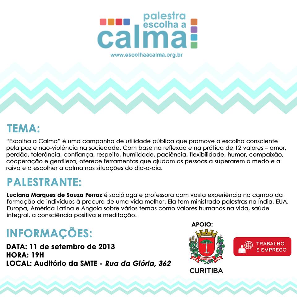Palestra ESCOLHA A CALMA – por Luciana Ferraz – Coordenadora Nacional da Brahma Kumaris Brasil – em Curitiba. Não perca!