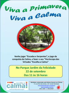 Venha participar! Uma tarde no Parque Jardim da Felicidade – Pirituba – São Paulo. Dia 22 de setembro das 11h às 16h. Muitas brincadeiras e jogos pra você se divertir e conquistar a calma – Jogos Escadas e Serpentes; Horóscopo das Virtudes Escolha a Calma. Traga sua família e amigos!